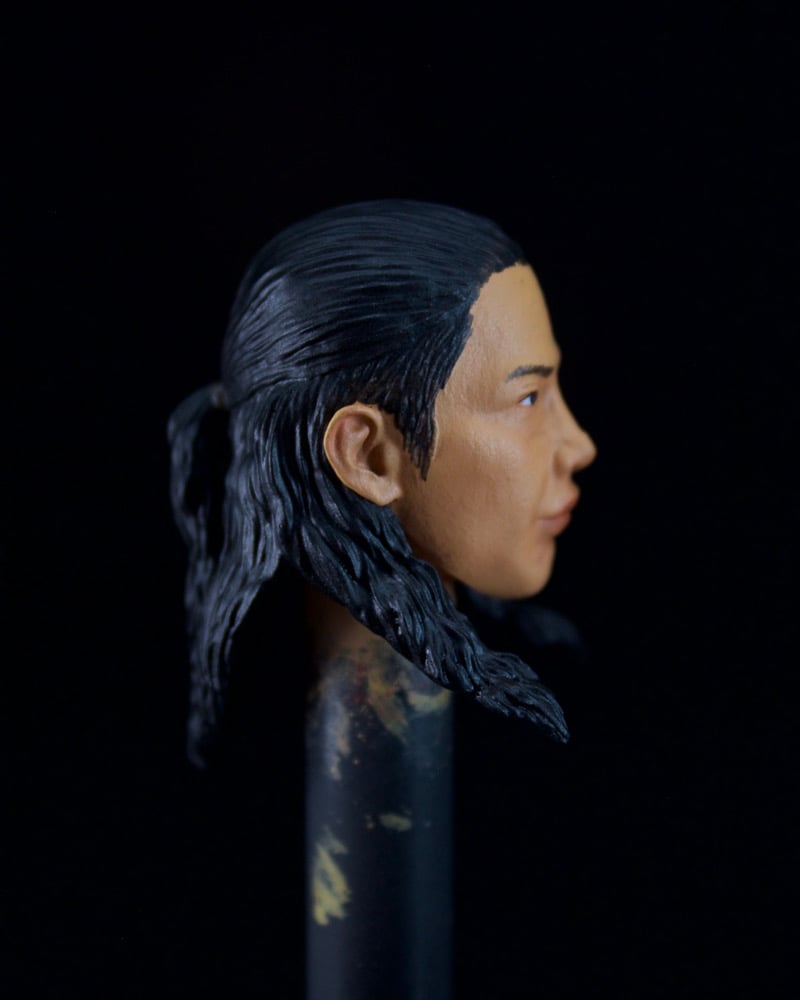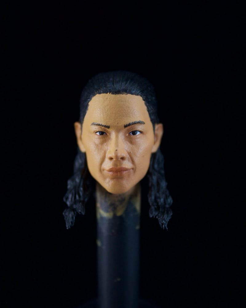This painted head sculpt is printed with hard resin and painted with acrylic paint. Should mainly be used for hobby display. Attempting to flex the hair will potentially break.